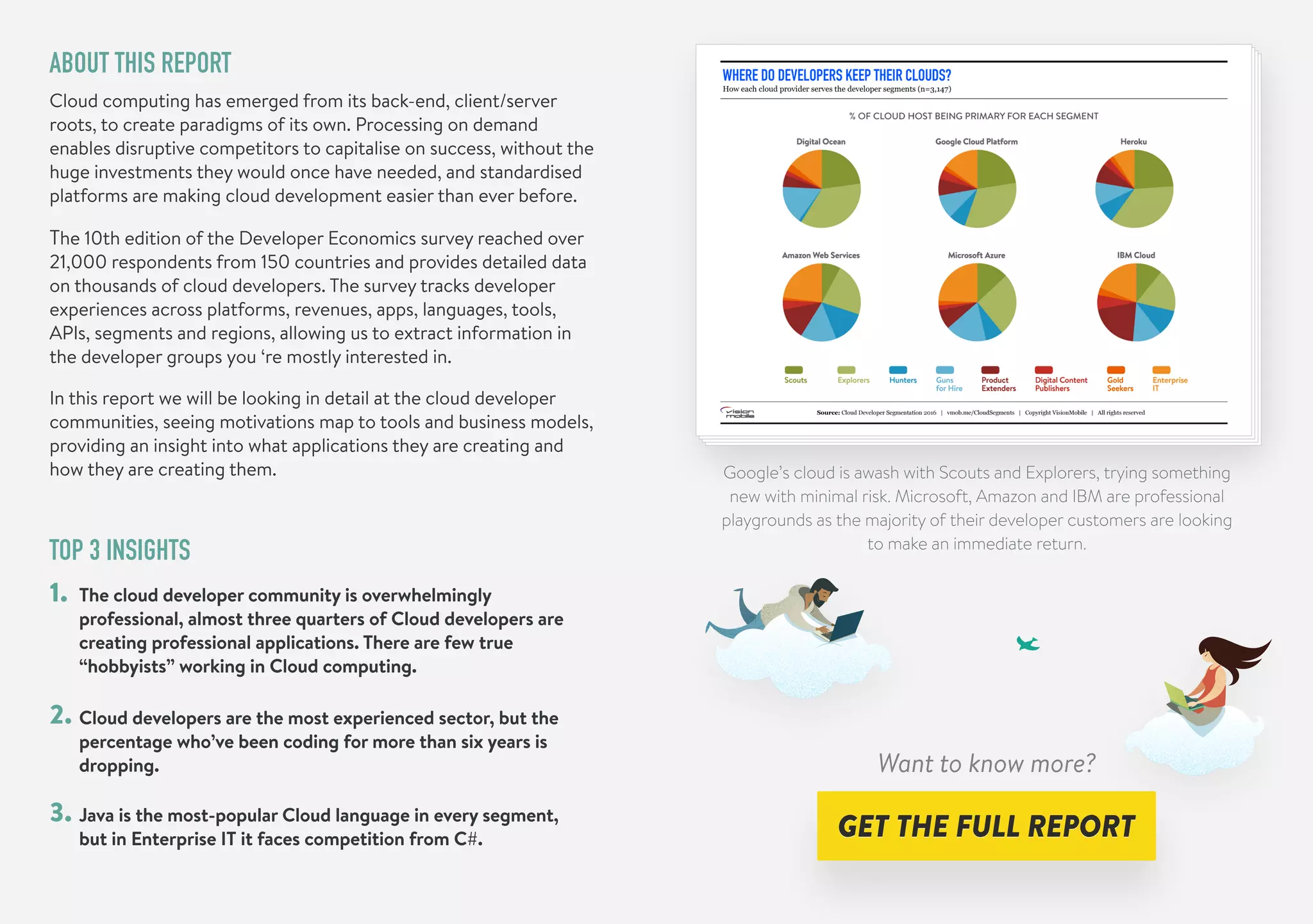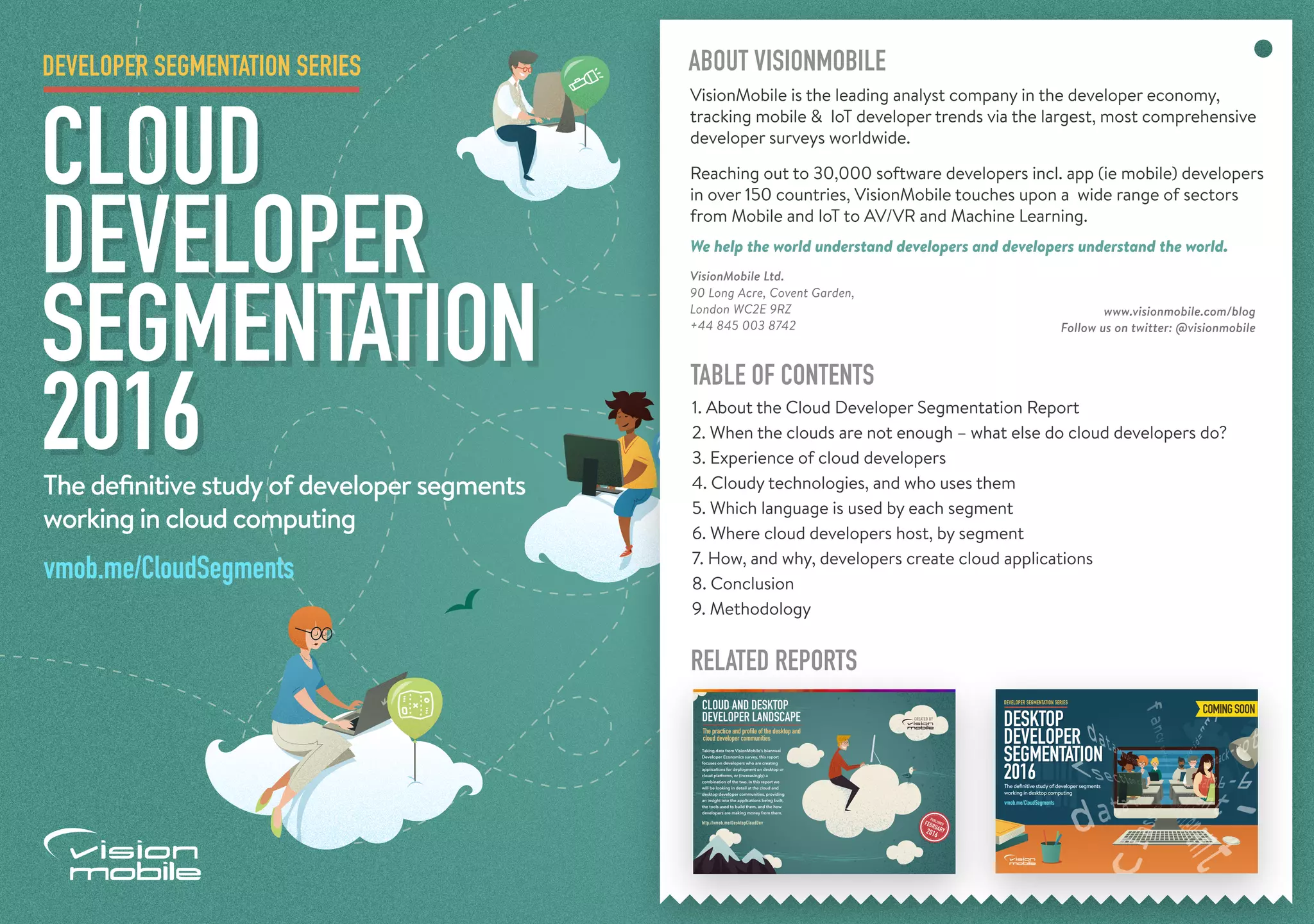The VisionMobile report on cloud developer segmentation analyzes trends among developers working in cloud computing, based on a comprehensive survey of over 21,000 respondents from 150 countries. Key insights reveal that the majority of cloud developers are professionals focused on creating applications, with Java as the leading programming language, while platforms like Google Cloud attract experimental developers. The report highlights motivations, tools, and the emerging landscape of cloud development.