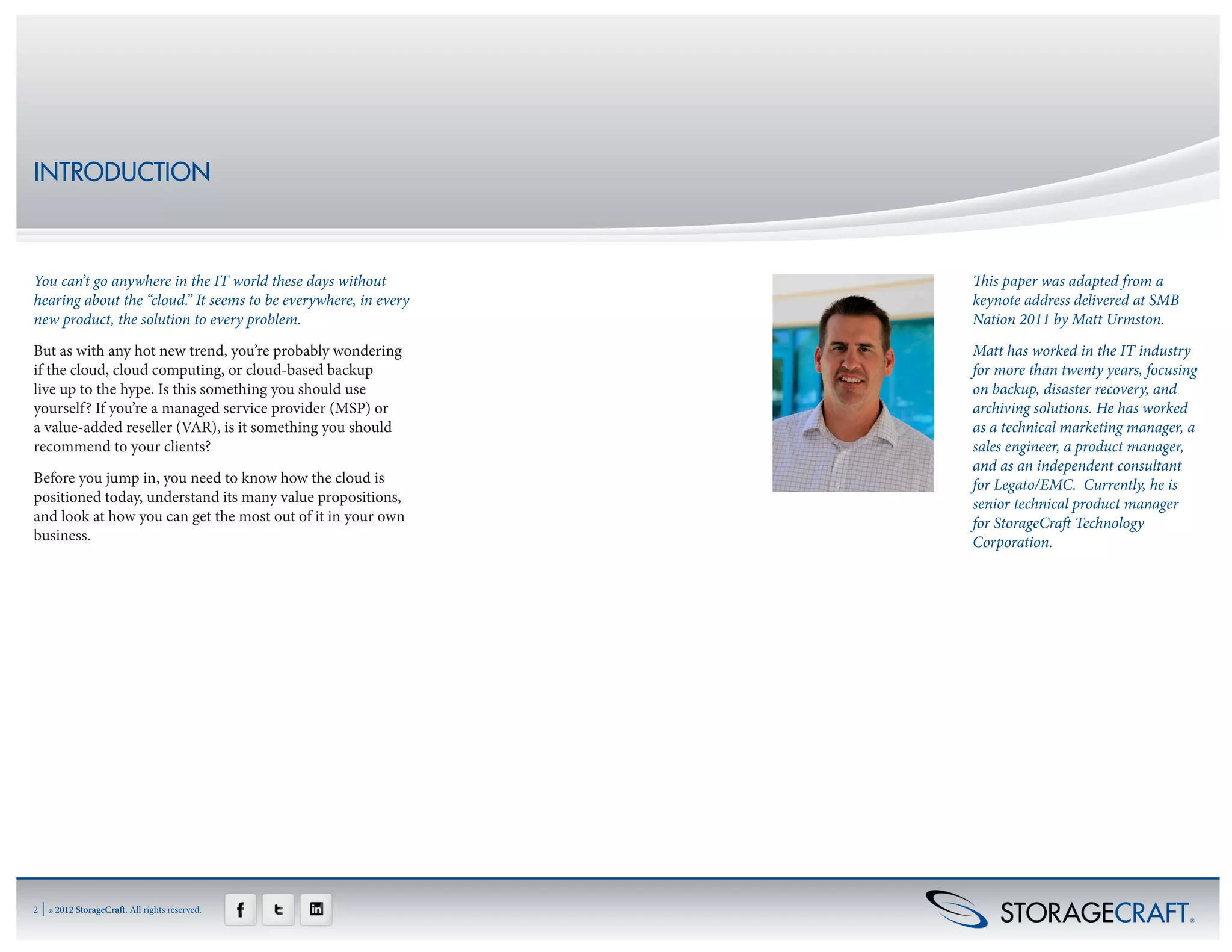 The document provides an overview of cloud computing and advice for managed service providers and value-added resellers on adopting and recommending cloud solutions to clients. It summarizes that cloud adoption will be gradual as businesses will maintain some on-site solutions and hybrid models. It advises providers to [1] become experts on cloud solutions, [2] understand service level agreements of cloud providers, [3] build customized solutions that meet client needs and budgets, and [4] avoid rushing clients into full cloud adoption and allow a phased approach.