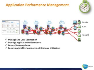 The document discusses the critical aspects of application performance management (APM) in cloud environments, highlighting lessons learned from both private and public clouds. It emphasizes the importance of end-user experience, the relative nature of time and resources in cloud contexts, and the necessity of effective APM strategies to manage costs and optimize performance. Key takeaways include the uniqueness of private versus public clouds, the challenges of rapid elasticity, and the focus on operational costs rather than just resource allocation.