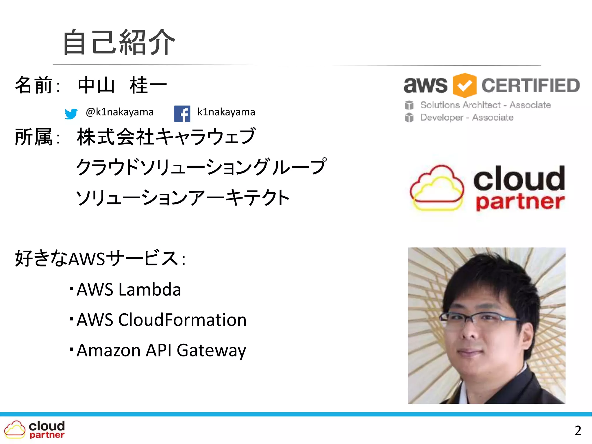 k1nakayama 所属: 株式会社キャラウェブ クラウドソリューショングループ ソリューションアーキテクト 好きなAWSサービス: ・AWS Lambda ・AWS CloudFormation ・Amazon API Gateway 2