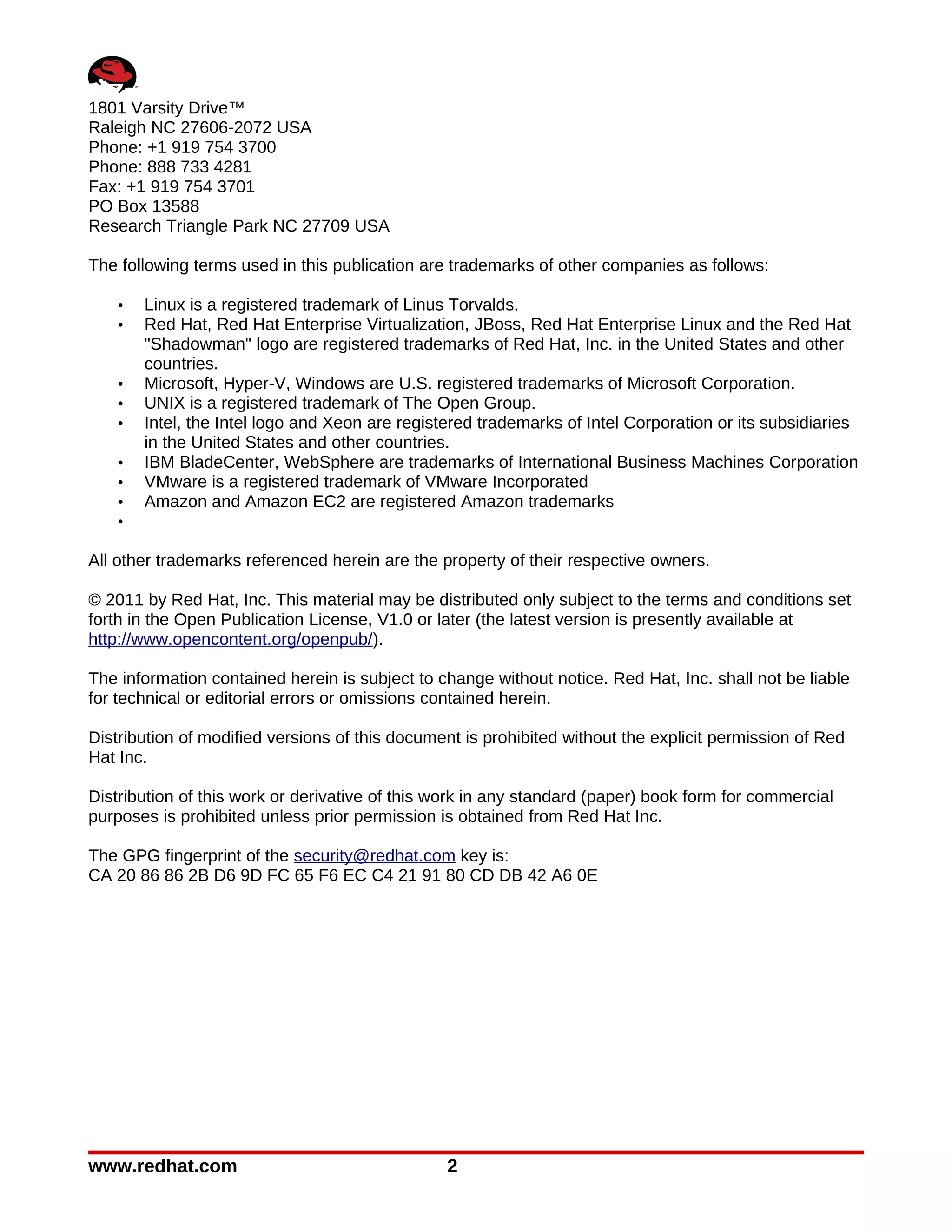 This document provides instructions for deploying a private Infrastructure as a Service (IaaS) cloud using Red Hat Cloud Foundations components. It describes setting up the necessary infrastructure services including the Red Hat Enterprise Linux, Red Hat Enterprise Virtualization, Red Hat Satellite, and JBoss middleware components. It then outlines the steps to deploy virtualization hosts, provision tenant virtual machines, and configure high availability clustering.