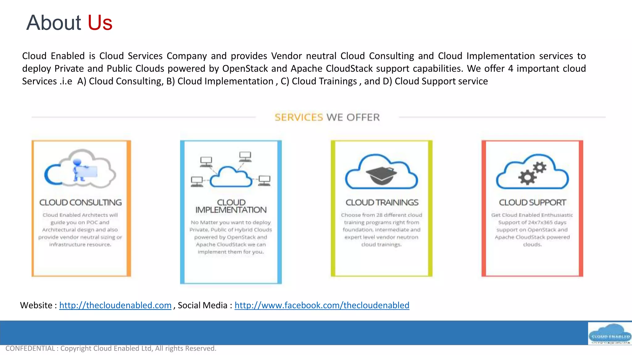 Cloud Enabled is a cloud services company that provides vendor-neutral cloud consulting and implementation services to deploy private and public clouds powered by OpenStack and Apache CloudStack. It offers four main cloud services: cloud consulting, cloud implementation, cloud trainings, and cloud support. All implementation services are backed by Cloud Enabled's enthusiastic support services.