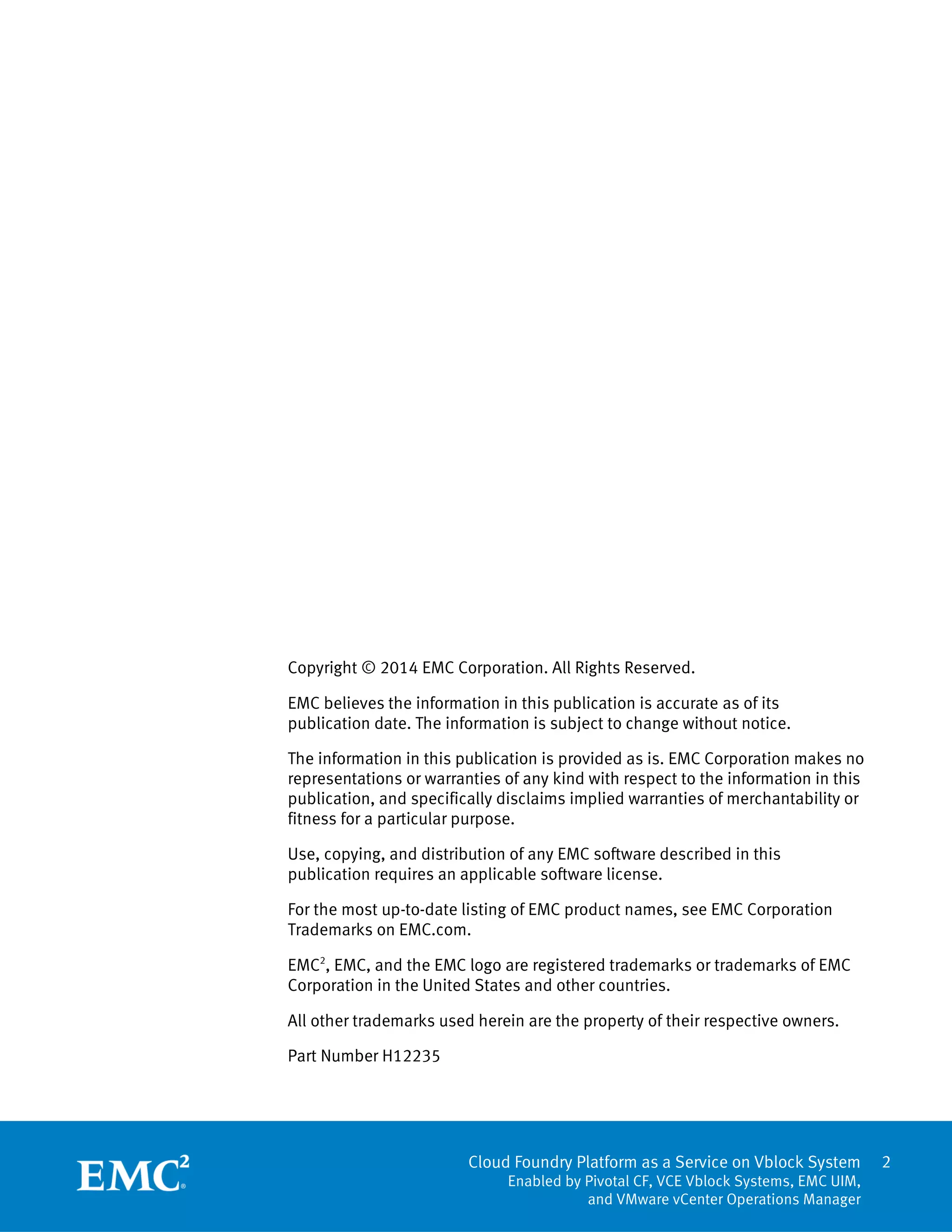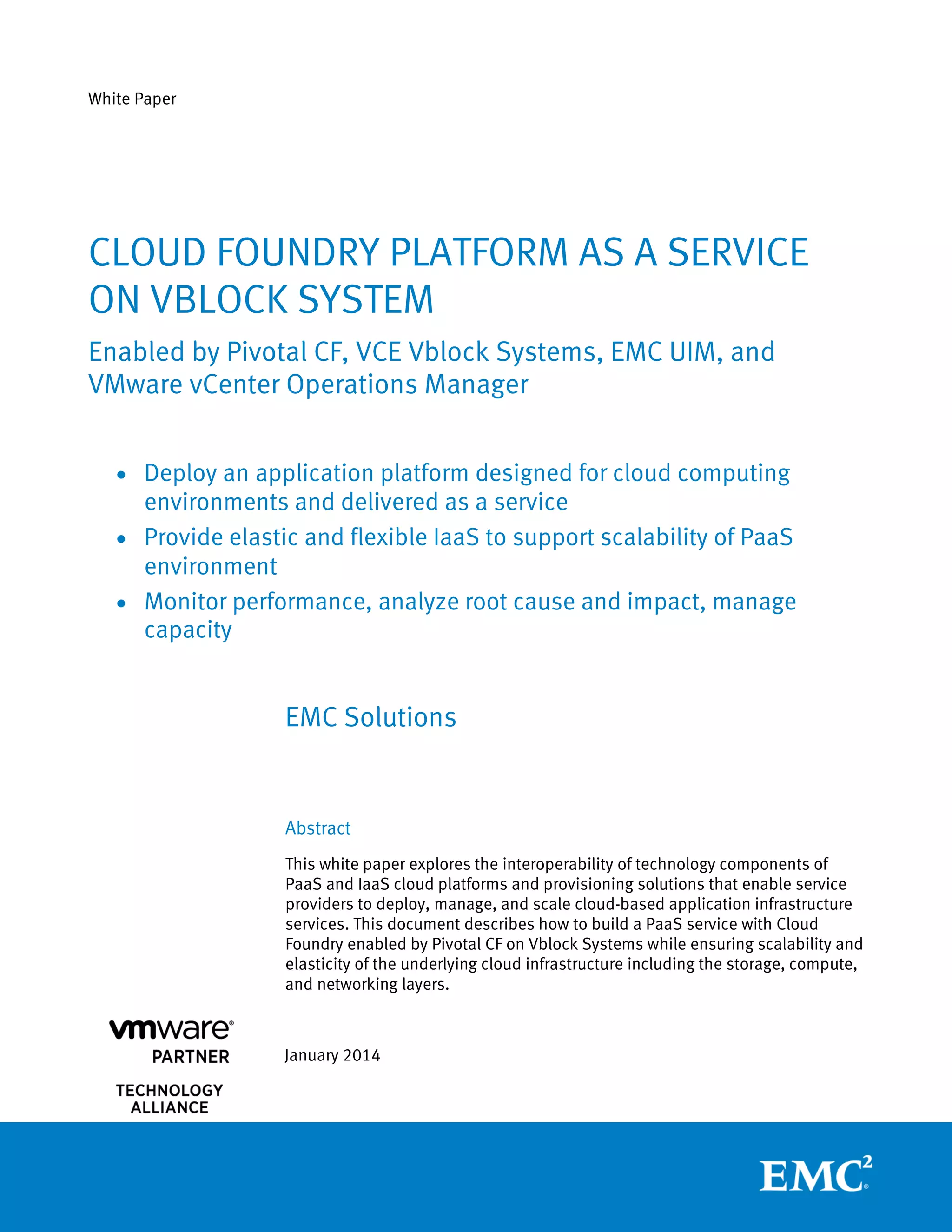 This white paper discusses the interoperability of technology components within PaaS and IaaS cloud platforms, focusing on deploying and managing Cloud Foundry services using Pivotal CF on Vblock systems. It outlines how to ensure scalability and elasticity in cloud infrastructures while automating application management, thereby allowing service providers to efficiently manage resources and support rapid application development. Key components include Pivotal CF, EMC Unified Infrastructure Manager, and VMware vCenter Operations Manager, essential for provisioning and monitoring performance in a dynamic PaaS environment.
