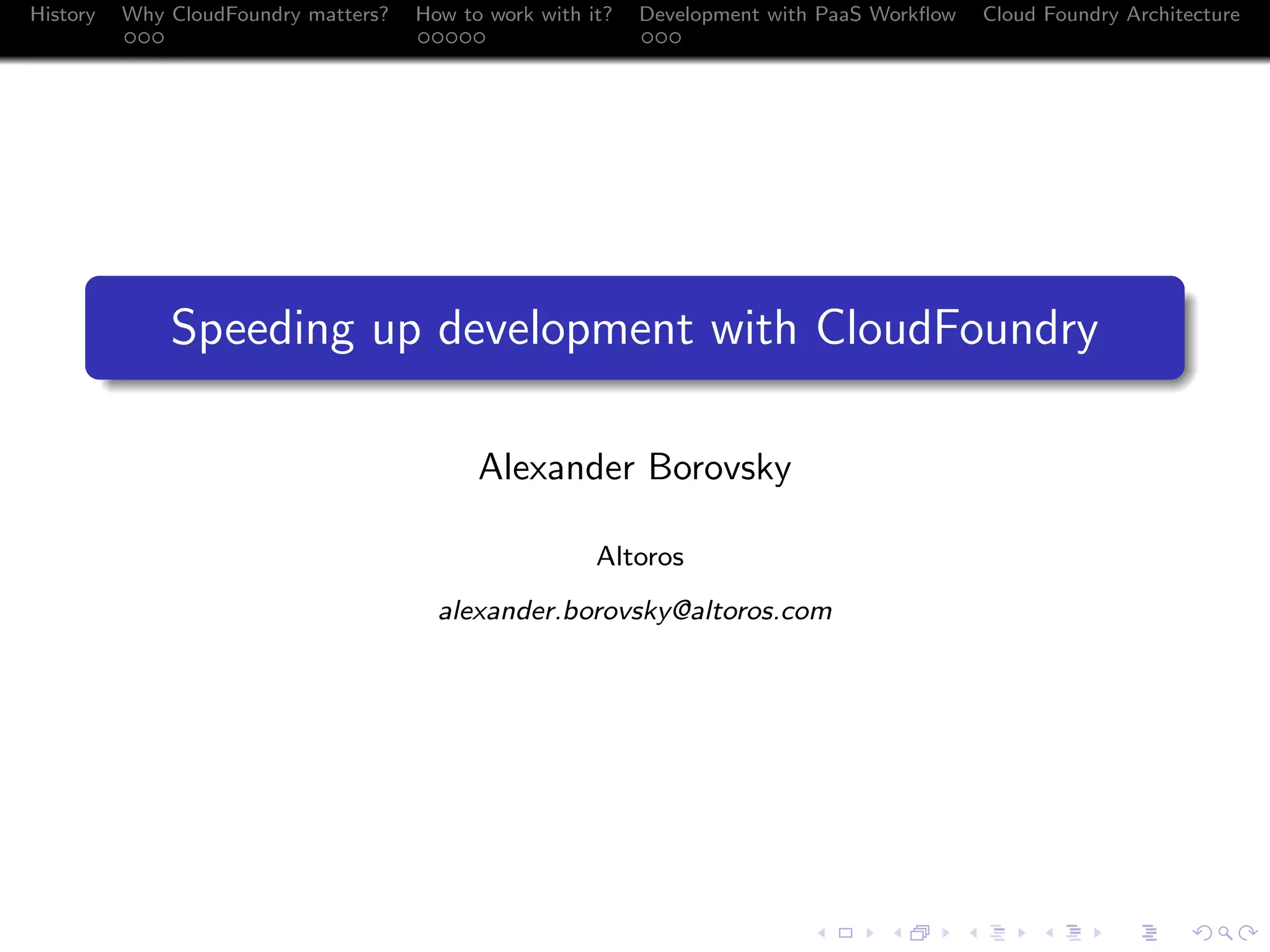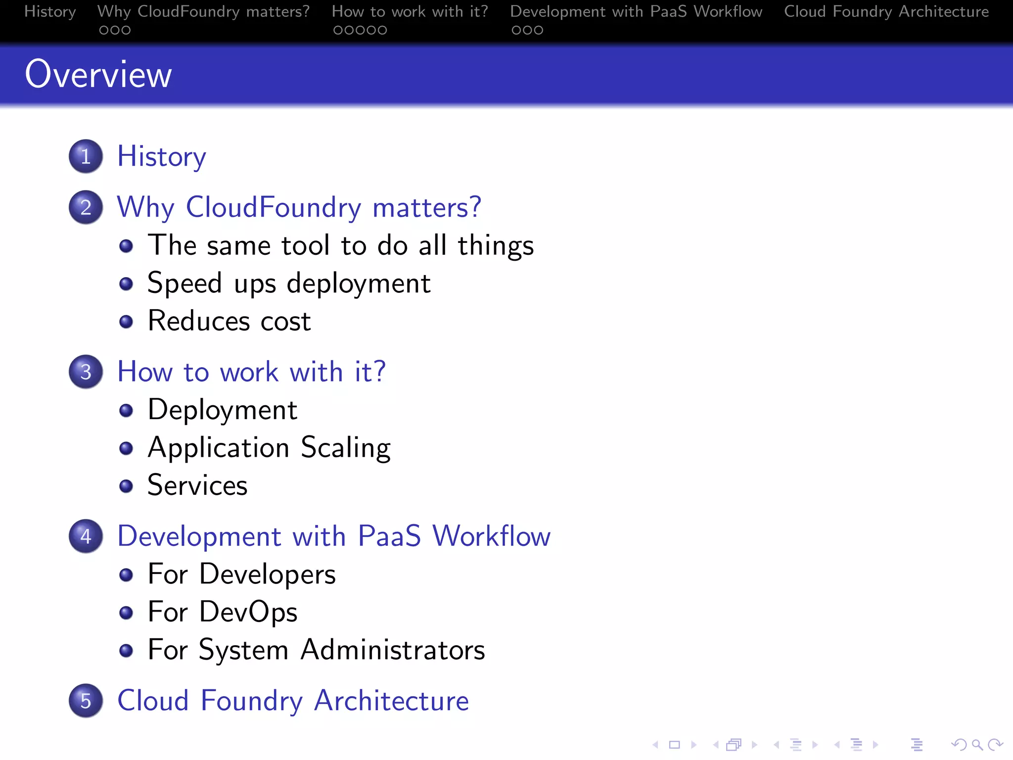 The document provides an overview of Cloud Foundry, highlighting its history, importance, and architecture. It explains how Cloud Foundry can streamline development processes, reduce costs, and enhance deployment efficiency. Additionally, it discusses the different workflows for developers, DevOps, and system administrators, along with the platform's scalable service architecture.