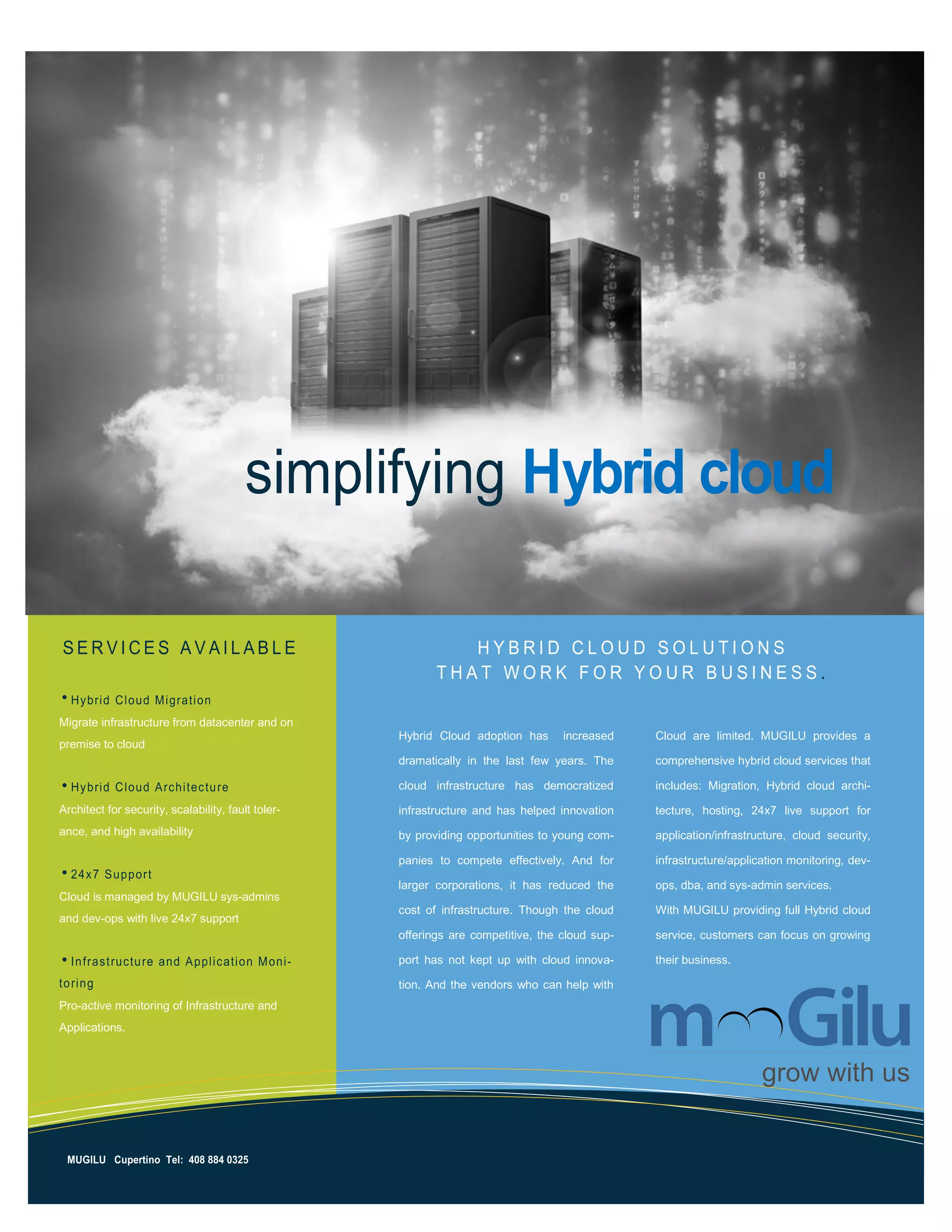 MUGILU provides comprehensive hybrid cloud services including migrating infrastructure from on-premise to cloud, architecting for security and high availability, and proactively monitoring infrastructure and applications with 24/7 support from their sys-admins and dev-ops teams. As hybrid cloud adoption has increased, MUGILU aims to help customers focus on growing their business by handling cloud support and services rather than having customers deal with limited vendor support themselves.
