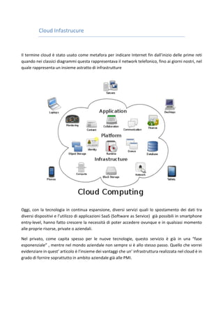 Il documento analizza i vantaggi delle infrastrutture cloud, evidenziando l'importanza del modello Infrastructure as a Service (IaaS) per le aziende, in particolare le PMI. Si discute la flessibilità, la scalabilità e il costo inferiore rispetto ai sistemi tradizionali, ma si enfatizza anche il rischio di sicurezza associato all'uso del cloud. Infine, viene presentato l'approccio ibrido come una soluzione che combina i benefici dei sistemi on-premise e cloud, bilanciando sicurezza e prezzo.