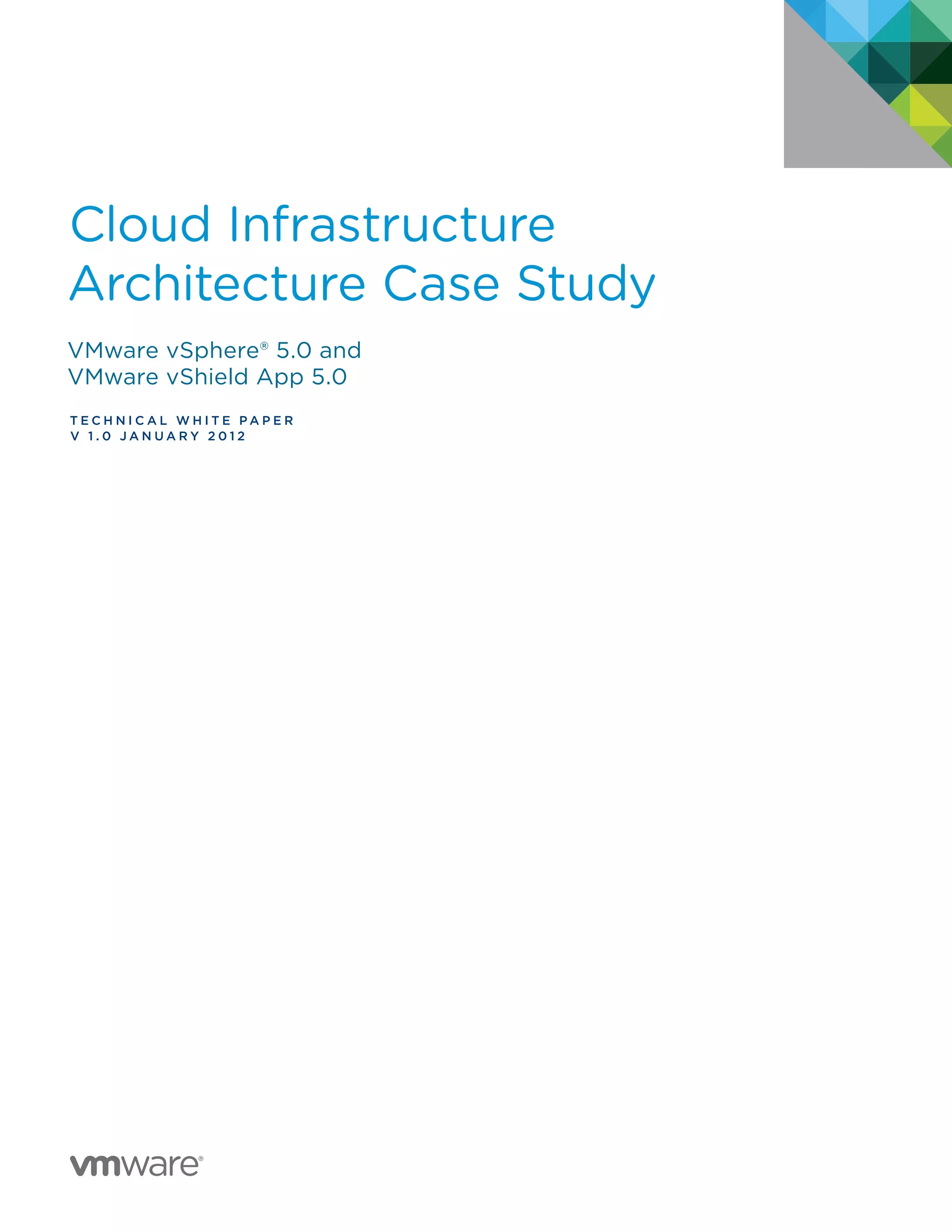 The document is a technical white paper that provides a detailed case study of VMware's cloud infrastructure architecture, focusing on VMware vSphere® 5.0 and VMware vShield App 5.0. It outlines the architecture, requirements, design considerations, and implementation strategies, along with various use cases and technology integrations. The paper emphasizes the importance of network design, storage solutions, and security mechanisms within the infrastructure architecture.