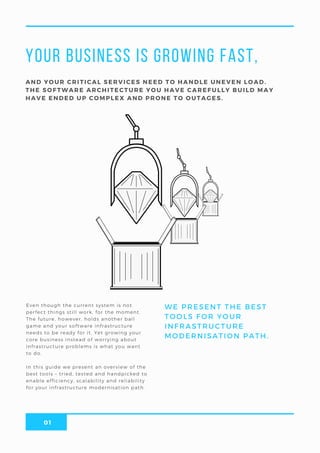 The document serves as a guide for modernizing cloud infrastructure, emphasizing the importance of tools such as Docker and Kubernetes for enhancing efficiency, scalability, and reliability. It outlines steps for improving application deployment through container technologies and continuous integration and deployment practices, while also addressing the selection of appropriate cloud service providers. By adopting these strategies, businesses can focus on growth while minimizing infrastructure-related issues.