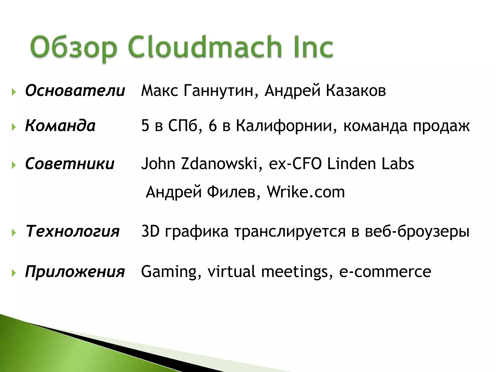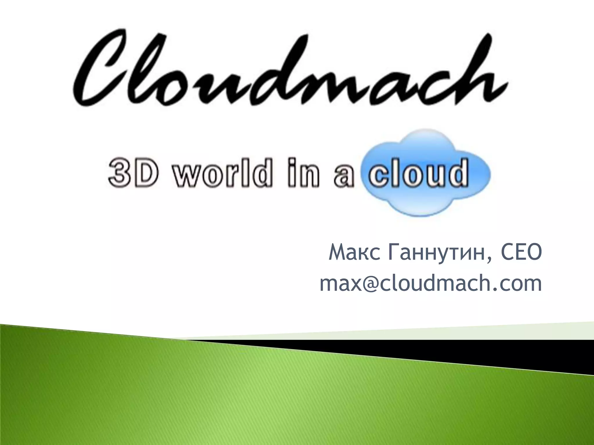 Документ содержит обзор компании Cloudmach, основанной Максом Ганнутином и Андреем Казаковым, с командами в Санкт-Петербурге и Калифорнии. Cloudmach предлагает уникальную технологию 3D-графики, которая интегрируется с веб-браузерами без необходимости установки дополнительных приложений, и использует бизнес-модель на основе ко-продакшн и микротранзакций. Также упоминается о росте рынка виртуальных товаров, с ожидаемыми доходами в $17.3 миллиарда к 2015 году.