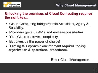 This document discusses the need for cloud management tools to effectively manage infrastructure in the cloud. It argues that while cloud computing removes some complexities, organizations still have responsibilities around architecture, configuration, monitoring, backups, scaling, logging, deployments and security. Cloud management tools aim to reduce the operational costs and risks of managing dynamic cloud infrastructure by providing automation, templates, monitoring dashboards and other capabilities. The document provides examples of how cloud management can help with tasks like scaling databases and securing access. It also outlines common features of cloud management solutions and discusses when they may be needed over creating custom scripts.