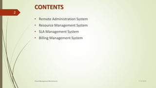 This document discusses various cloud management mechanisms including remote administration systems, resource management systems, SLA management systems, and billing management systems. The remote administration system provides tools for administrators to configure cloud resources through usage and administration portals or self-service portals. Resource management systems help coordinate IT resources in response to management actions. SLA management systems monitor cloud service performance to ensure contractual QoS requirements are met. Billing management systems collect usage data to generate reports and invoices for cloud providers and consumers.