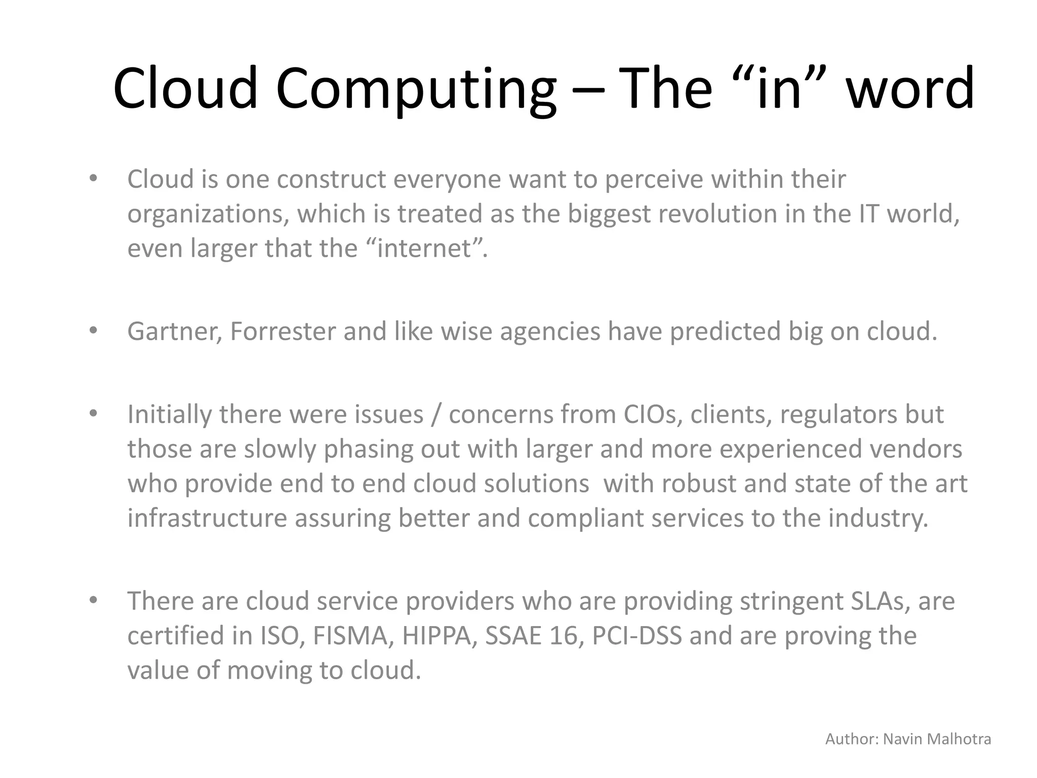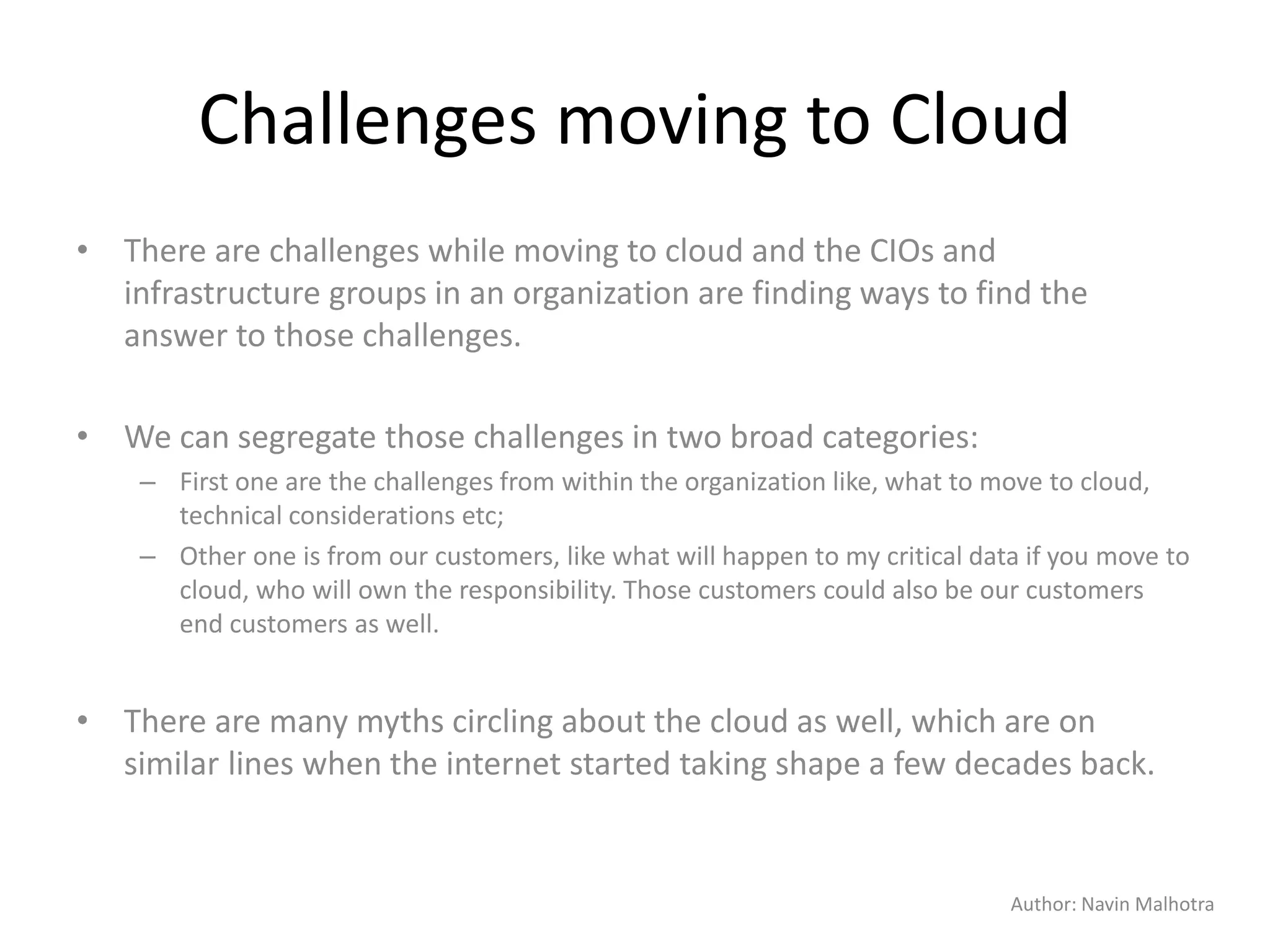 The document discusses cloud computing and the challenges of moving to the cloud. It notes that while cloud is seen as a major revolution, there are still concerns from organizations about security, compliance, and control of critical data in the cloud. However, many large cloud providers are addressing these issues by providing stringent security controls and certifications. The document outlines two main categories of challenges - those within the organization regarding what to move and technical considerations, and those from customers regarding data ownership and responsibility. It recommends a careful assessment and planning process to determine what should move to public, private or on-premise systems based on factors like regulatory requirements and application characteristics. A multi-stage approach including scoping, planning and cost estimation is suggested for a successful