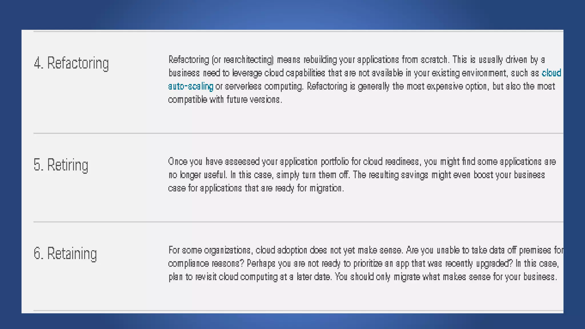 Cloud migration involves moving digital assets like applications and databases from a company's on-premise infrastructure to cloud infrastructure. There are several steps to a successful cloud migration including forming a migration team, assessing organizational readiness, choosing a cloud vendor and designing the cloud environment, creating a roadmap, choosing a migration strategy, migrating data, testing, and switching to production. Key risks of cloud migration include cost, loss of control, vendor lock-in, and potential performance issues. People, finances, and legal/compliance issues are also important factors to consider.