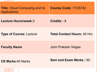 This document outlines the syllabus for a course on Cloud Computing and its Applications. It includes the course code, credits, objectives, outcomes, modules, textbook, and content to be covered. The course aims to explain cloud technology principles, compare programming models, and teach how to choose appropriate cloud models for applications. Key topics include cloud computing concepts, frameworks, data intensive computing, infrastructure as a service, platform as a service, software as a service, and virtualization.