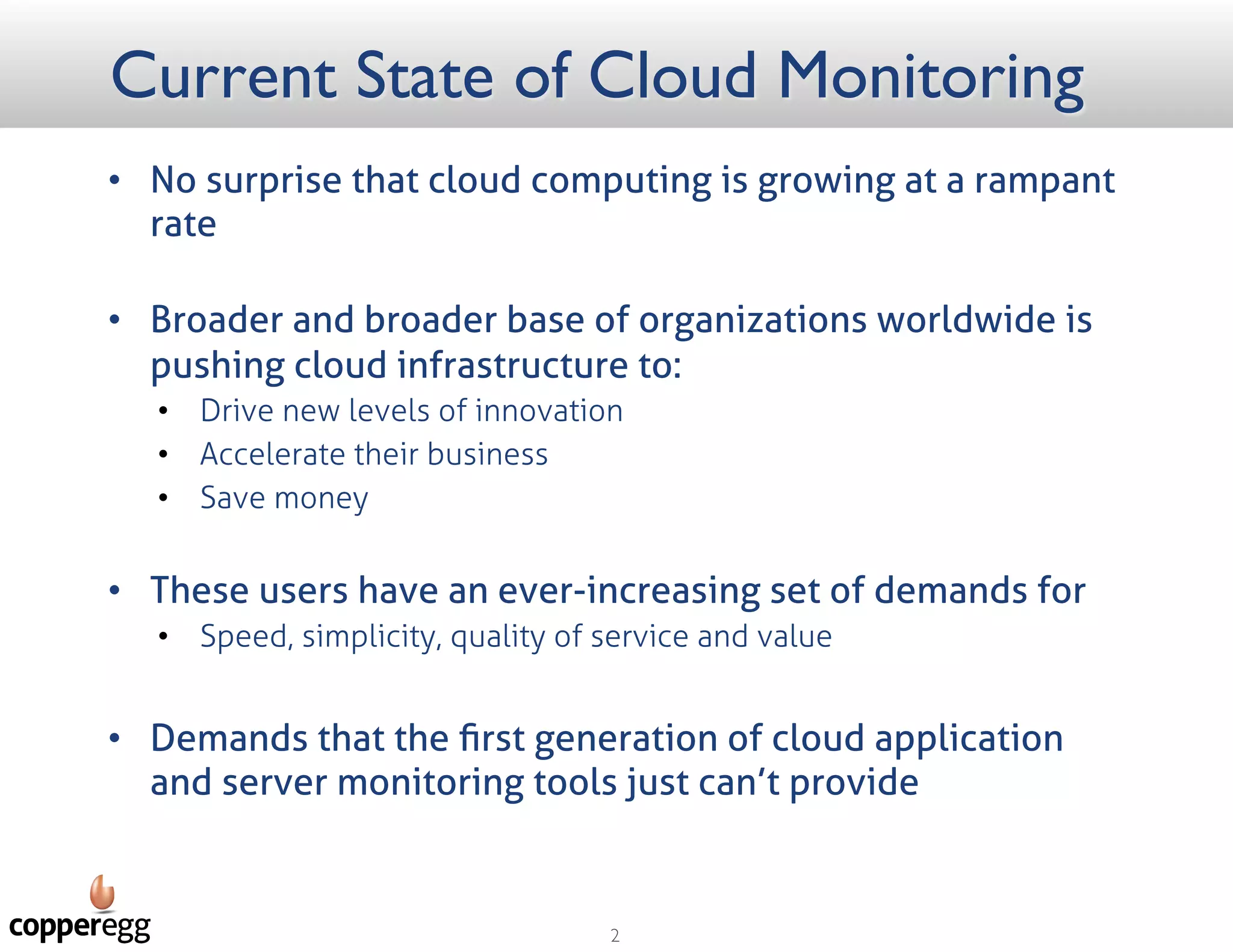 This document discusses the need for second generation cloud monitoring tools and outlines the five key elements of effective cloud monitoring: 1) being fast to detect issues within seconds, 2) using analytics and classification for intelligent monitoring, 3) providing unified views across systems instead of fragmented tools, 4) being simple to set up and use without friction, and 5) using a utility-based pay-for-what-you-use pricing model. Current first generation tools are seen as inadequate for growing cloud demands and in need of improvement in these areas.