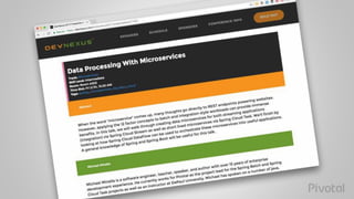 This document discusses how Spring Framework, Spring Batch, Spring Cloud, and Spring Cloud Task can be used together for cloud native batch processing. It provides an overview of the technologies and how they can be used to build scalable, fault tolerant batch applications. Code examples are shown for partitioning batch jobs across multiple servers to scale out processing and using Spring Cloud Data Flow to orchestrate batch workflows in a microservices architecture.