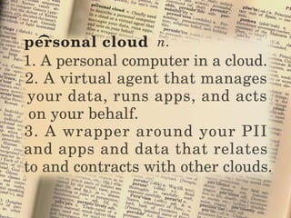 The document discusses the necessity of an operating system for personal clouds to enable independence from centralized services. It presents Kynetx's model for a decentralized, networked operating system that supports programmable data objects and facilitates intuitive online interactions and automation. The author posits that this operating system will transform user interactions and system management in the personal cloud space.