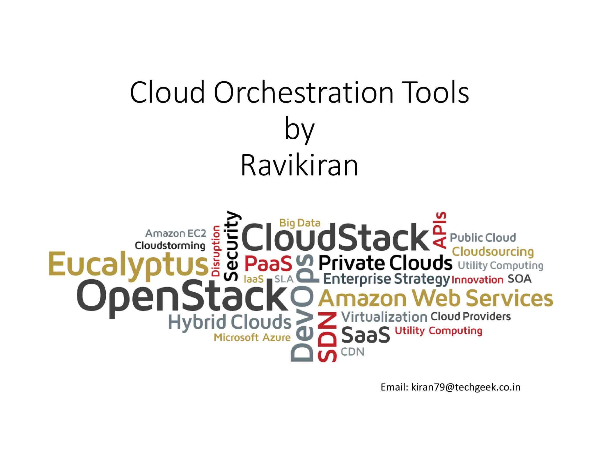 The document compares various cloud orchestration tools, specifically Eucalyptus, OpenStack, and CloudStack, discussing their architecture, components, functionalities, and installation steps. It highlights the unique features and functionalities of each platform, including user self-service, storage management, and security mechanisms. Additionally, the document provides insights on high availability, fault tolerance, and contrasts the strengths and weaknesses of the tools in different operational contexts.