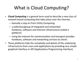 Cloud computing provides on-demand access to shared computing resources like networks, servers, storage, applications and services available over the internet. It has several advantages like lower costs, automatic software updates, unlimited storage and reliability. However, it also has disadvantages like requiring a constant internet connection and potential slowness. The document discusses key concepts of cloud computing including characteristics, service models, virtualization, opportunities and challenges of cloud sourcing, commercial offerings and the future of cloud computing.