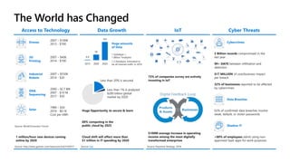 The document discusses the significant impact of digital transformation, particularly in relation to IoT, cloud computing, and cybersecurity, highlighting the projected growth of the global market. It notes that businesses leveraging technologies like AI and big data could gain substantial competitive advantages. The need for digital innovation is underscored as a critical factor for companies to thrive in an increasingly data-driven economy.