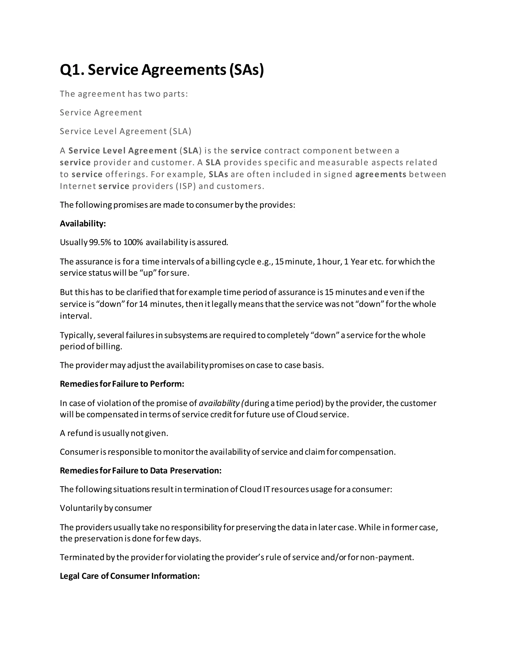 The document provides a comprehensive overview of cloud services, including service agreements, data center design, zero downtime architecture, cloud security threats, and virtualization. It discusses the components of service agreements like SLAs and remedies for failures, along with architectural challenges and the use of virtualization in disaster recovery. Additionally, it reviews performance issues, privacy concerns, and the importance of a structured risk management process in cloud environments.