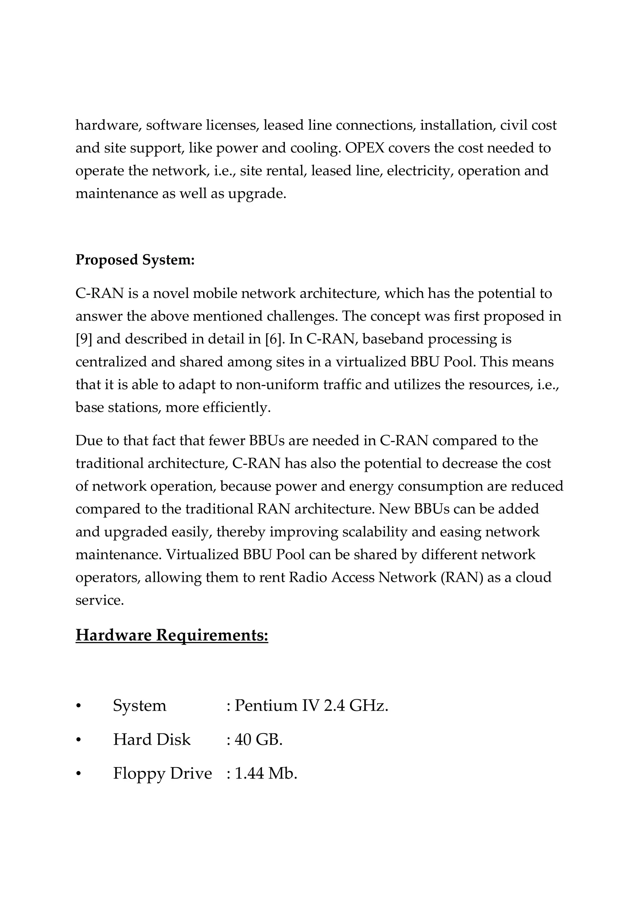 The document provides an overview of Cloud Radio Access Network (C-RAN), a mobile network architecture designed to enhance efficiency and reduce costs by centralizing baseband processing among multiple sites. C-RAN addresses the challenges of increasing user demand and improves network capacity through load balancing and cooperative signal processing, while also enabling easier upgrades and scalability. It serves as a comprehensive introduction for those interested in understanding and researching C-RAN architecture.
