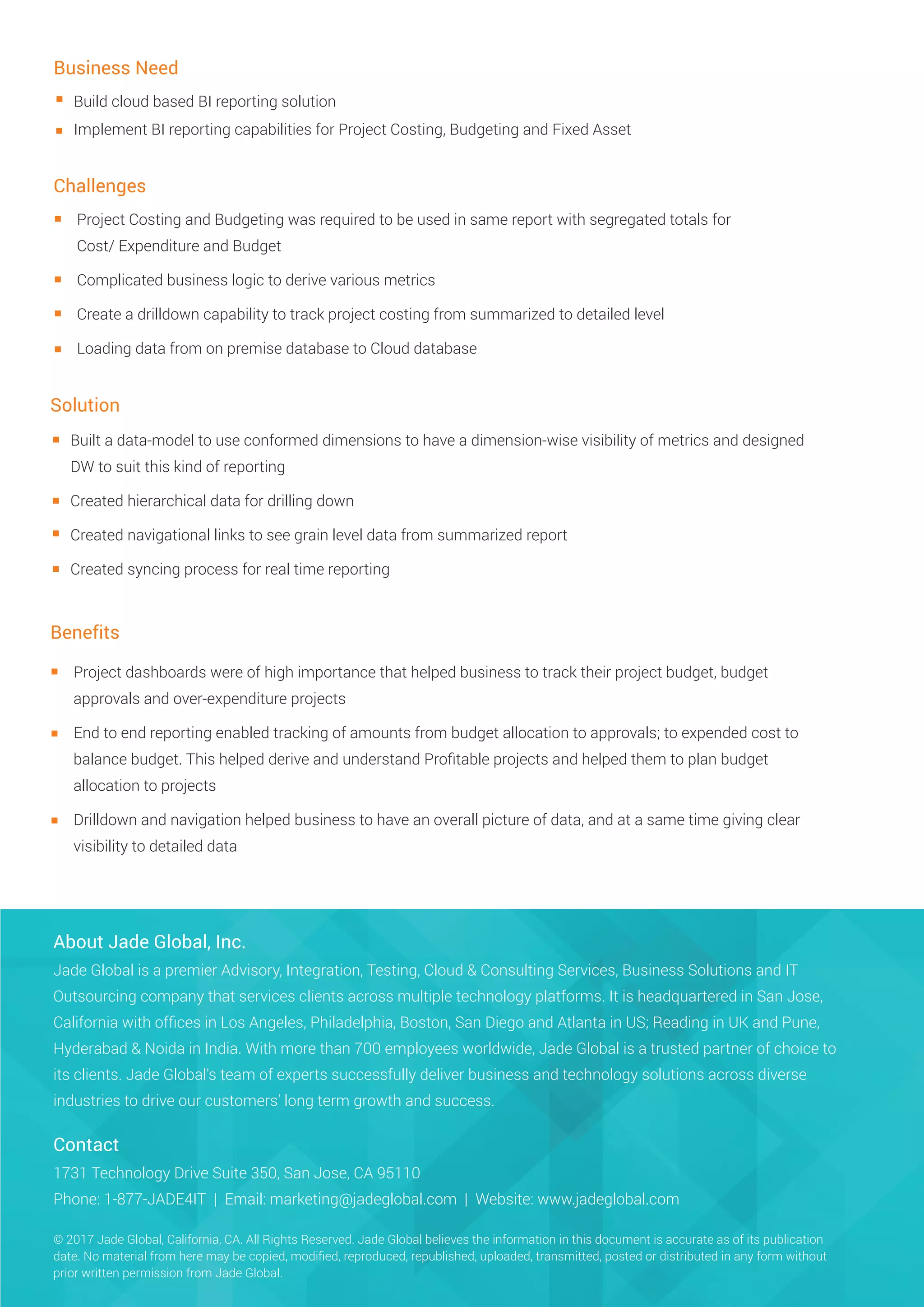 The document discusses a case study on implementing a cloud-based BI reporting solution for project costing and fixed assets using Oracle BICS. It details the challenges faced, such as the need for detailed project tracking and budget approvals, and the solutions provided, including dashboard creation and real-time reporting capabilities. Jade Global, the company behind this project, is described as a provider of advisory and technology solutions with a global presence.