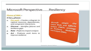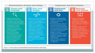 For cloud resilience, it outlines a structured 4-step approach: 1) Assessing assets and requirements, 2) Planning and designing resilience strategies, 3) Implementing and testing, and 4) Managing and sustaining resilience over time.