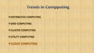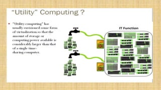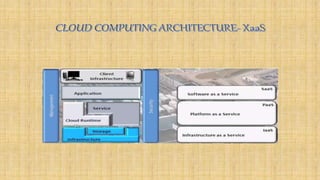Cloud architecture can be broadly divided into the front end, which consists of interfaces and applications for accessing cloud platforms, and the back end, which comprises resources for providing cloud services like storage, virtual machines, and security mechanisms. Common cloud service models include infrastructure as a service (IaaS), platform as a service (PaaS), and software as a service (SaaS). Virtualization techniques allow for the sharing of physical resources among multiple organizations by assigning logical names to physical resources and providing pointers to access them.