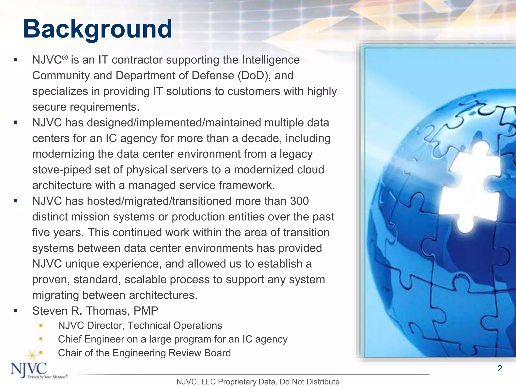 NJVC is an IT contractor that specializes in providing secure IT solutions, including designing, implementing, and maintaining secure cloud architectures for government agencies. NJVC has over a decade of experience hosting hundreds of mission systems and migrating systems between data center environments. Securing systems in the cloud presents unique challenges compared to traditional IT environments due to the shared nature of cloud resources. NJVC outlines a strategic framework for assessing, planning, transitioning, and sustaining secure cloud operations. This includes understanding security responsibilities, implementing necessary security services, properly transitioning systems to the cloud according to best practices, and establishing agreements and continuing authorization to maintain security.