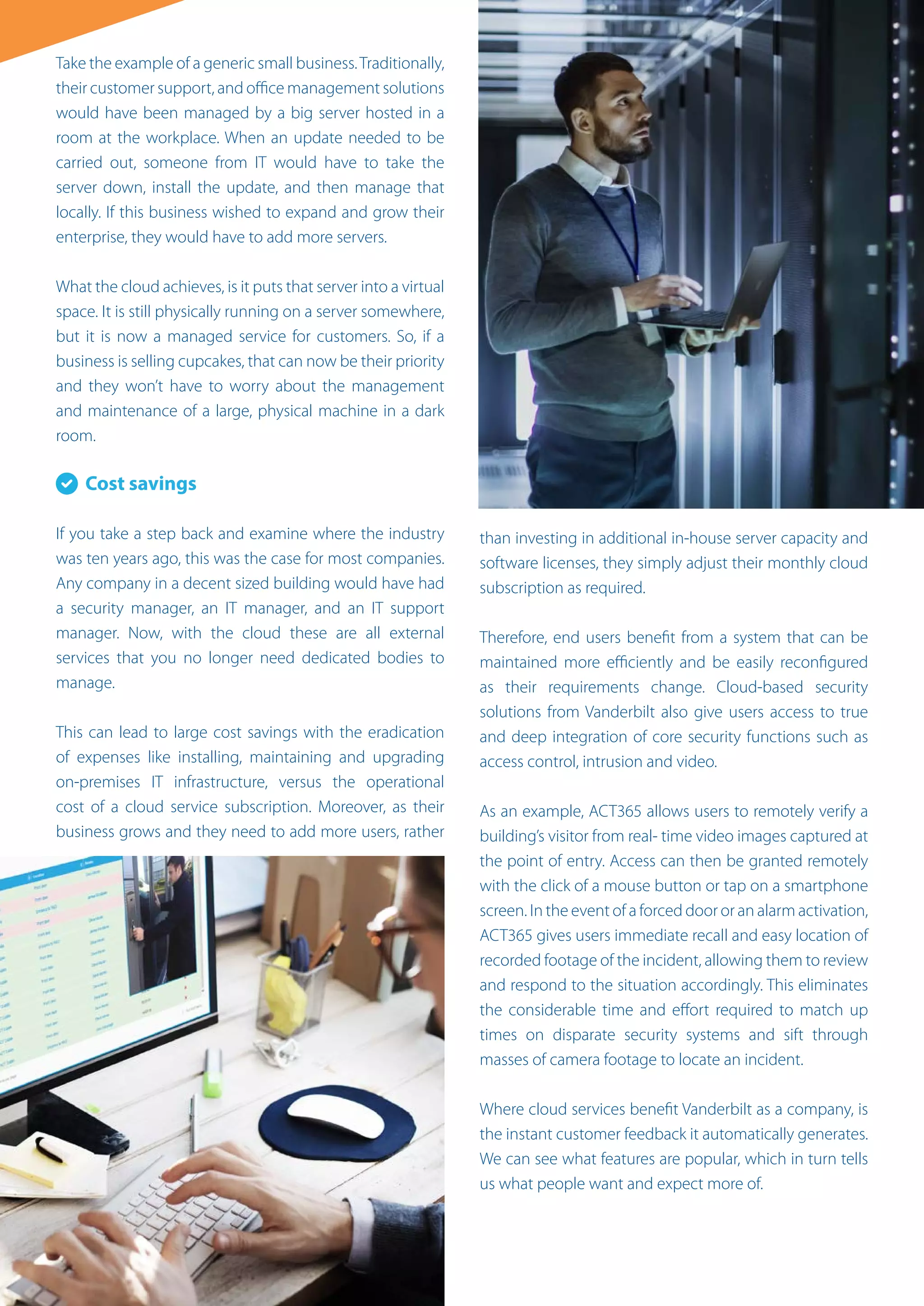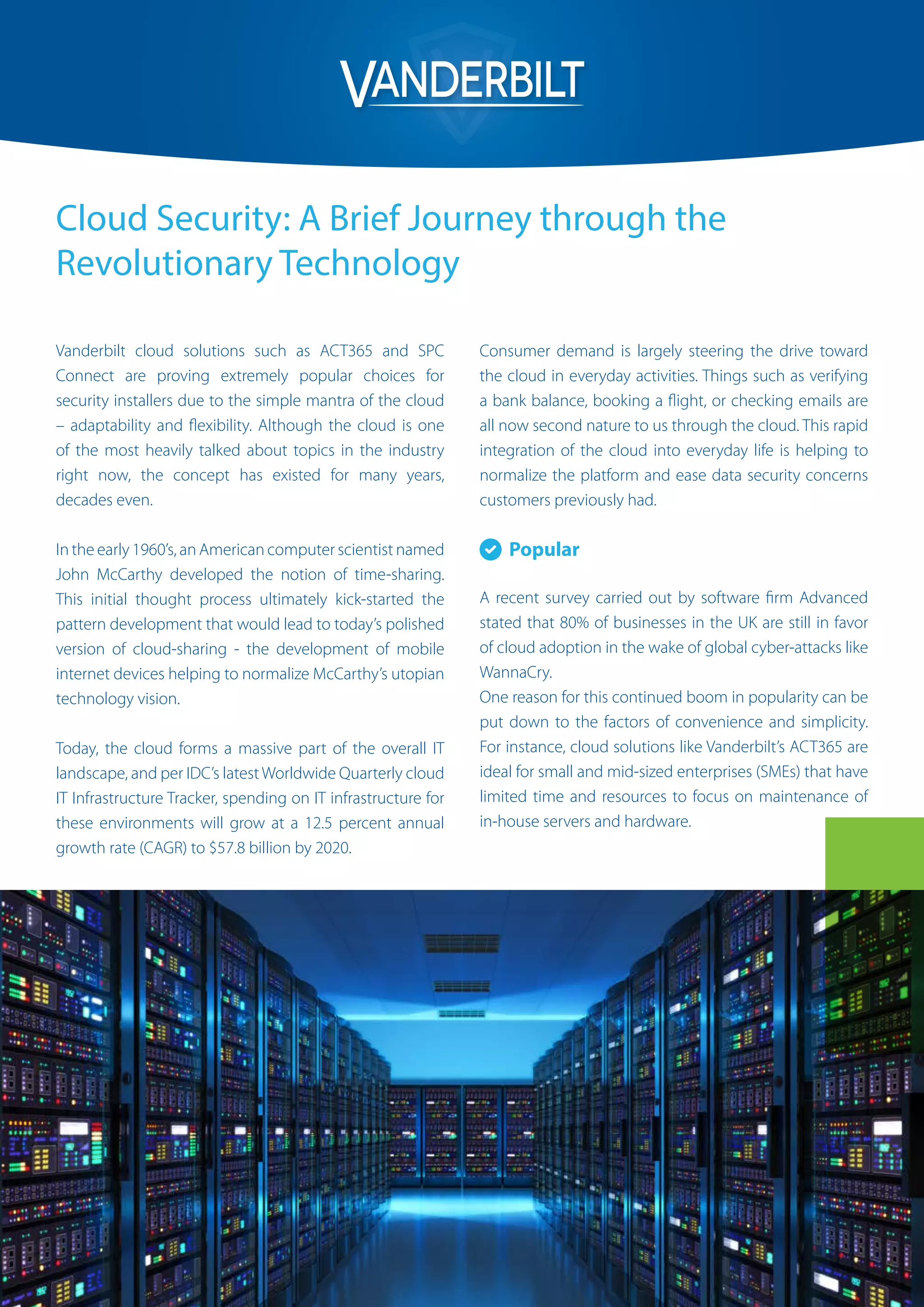 Vanderbilt cloud solutions such as ACT365 and SPC Connect are proving popular for security installers due to their adaptability and flexibility. The concept of cloud computing has existed for decades, originating from John McCarthy's idea of time-sharing in the 1960s. Today cloud spending is growing at 12.5% annually and is integrated into everyday activities. Cloud solutions offer convenience and simplicity for businesses, reducing costs compared to maintaining on-site servers. They provide remote access and management capabilities. While some have security concerns about the cloud, providers like Vanderbilt implement strong encryption to protect customer data.