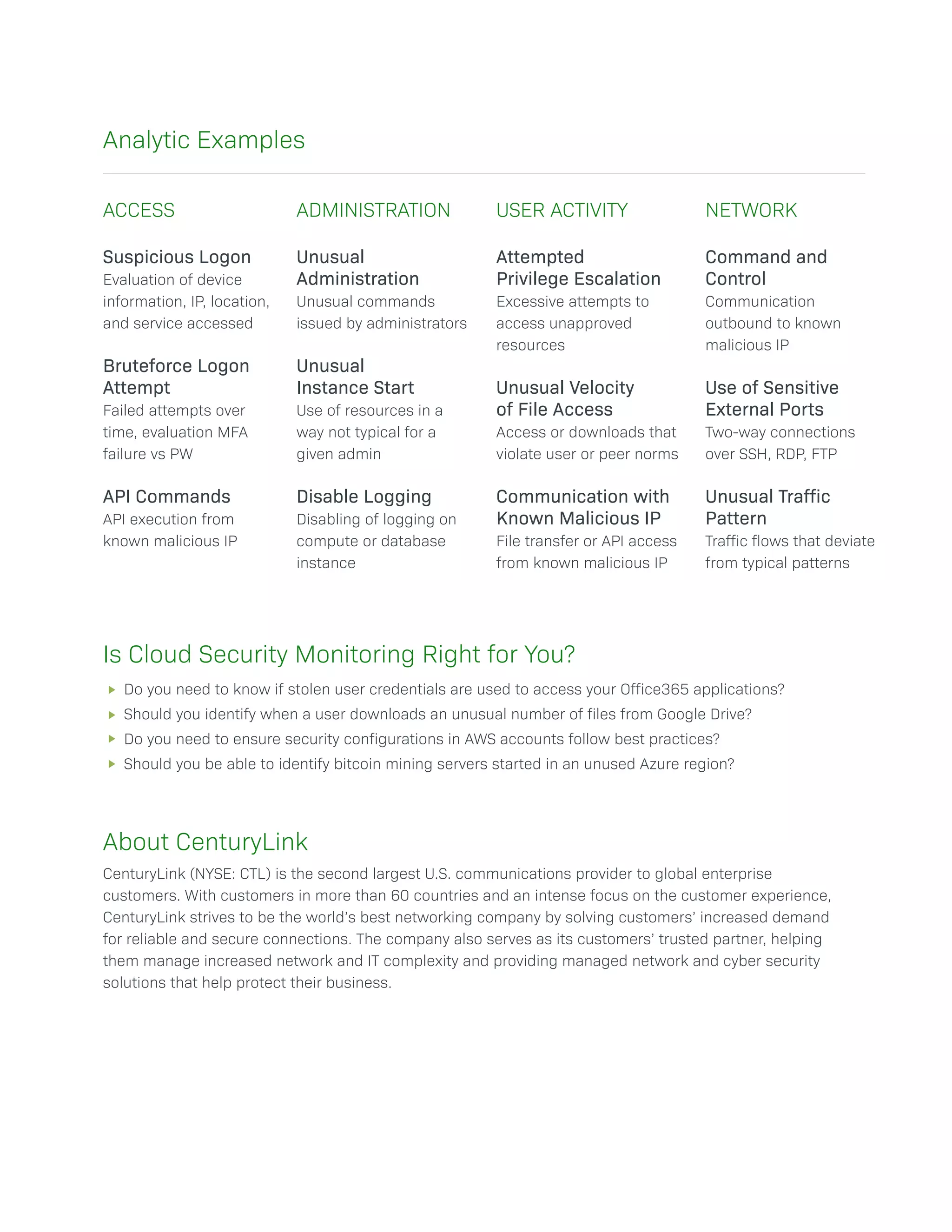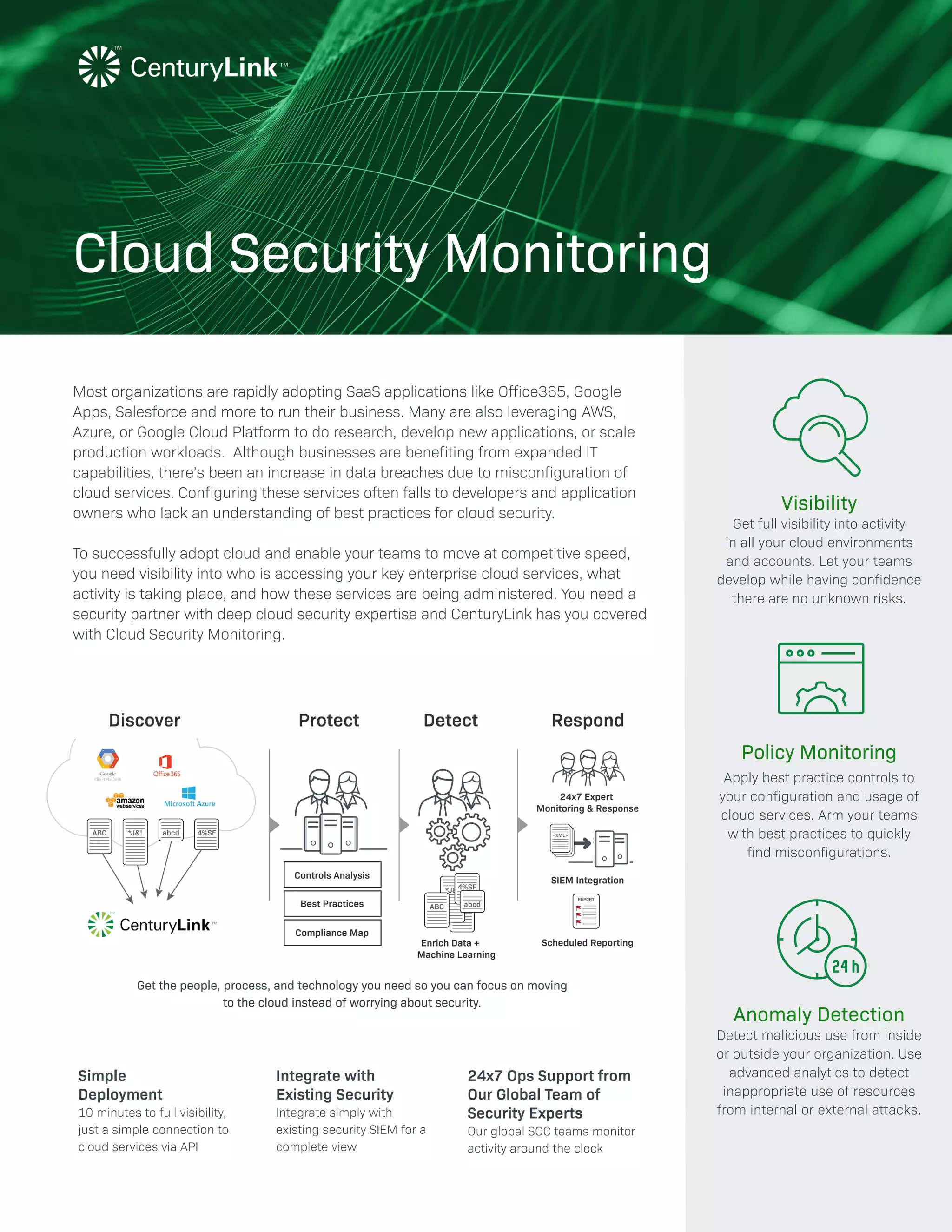 The document highlights the importance of cloud security monitoring for organizations rapidly adopting cloud services such as SaaS applications and platforms like AWS and Azure. It emphasizes the need for visibility into cloud activities and the implementation of best practice controls to mitigate risks and detect anomalies. CenturyLink is presented as a security partner that offers comprehensive monitoring solutions to protect enterprises from data breaches and misconfigurations.