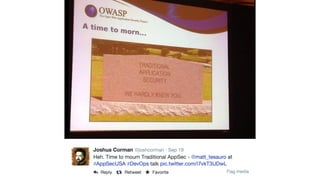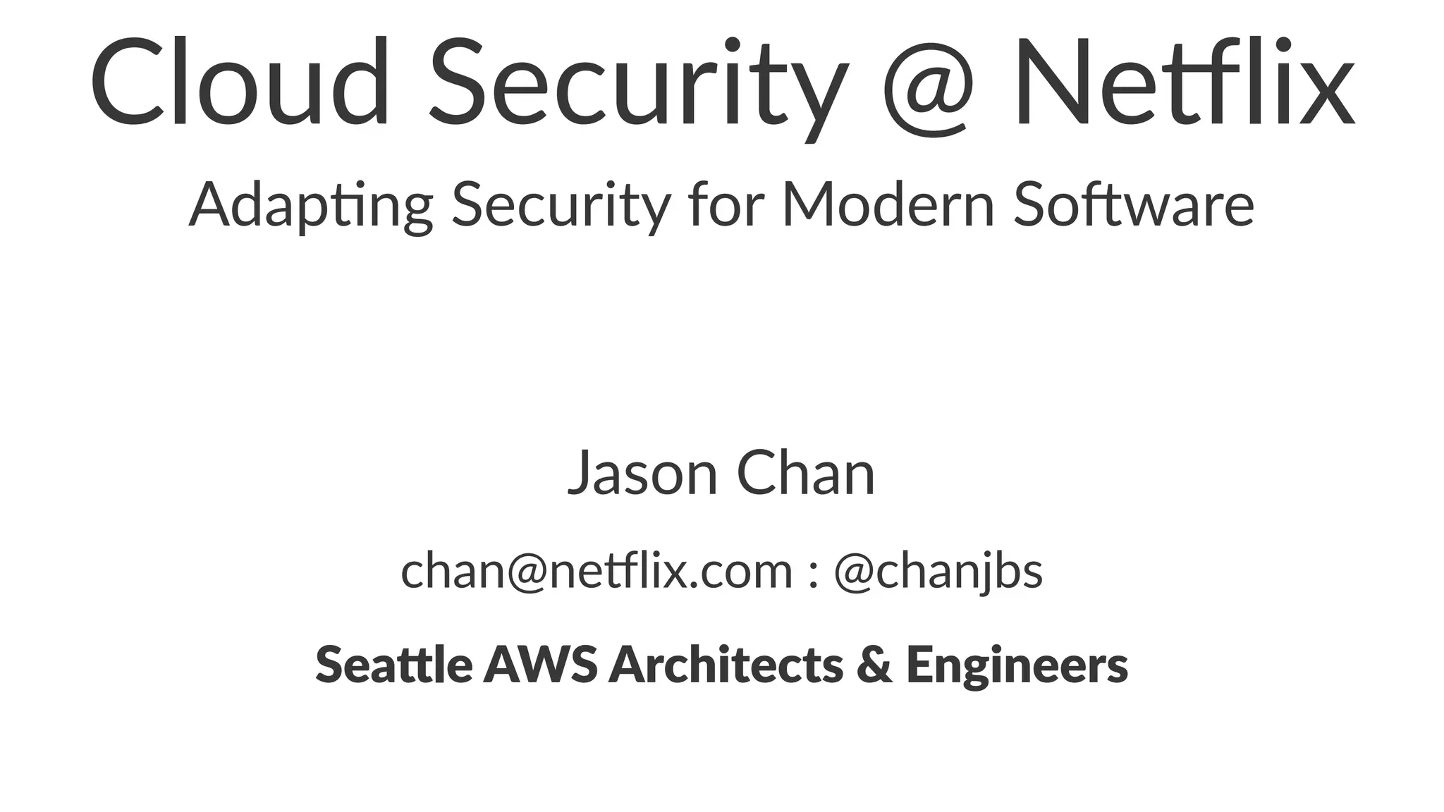 Jason Chan presented on adapting security practices for modern cloud-native software environments. He discussed how Netflix leverages AWS services like IAM, security groups, and CloudTrail to securely manage access, inventory assets, and monitor configuration changes at scale. Chan also emphasized the importance of visibility through discovery, risk prioritization, and multi-layer security testing integrated into the development pipeline. Monitoring configurations and detecting anomalies was highlighted as important for cloud security.