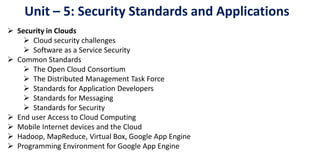 The document discusses cloud security, outlining the significance of implementing robust security measures across cloud environments to protect systems, data, and infrastructure. It highlights the shared responsibility model of security between cloud providers and users, emphasizing best practices for SaaS security such as enhanced authentication and data encryption. Additionally, it covers standards and initiatives from organizations like the Open Cloud Consortium and the Distributed Management Task Force, aimed at improving cloud management and security protocols.