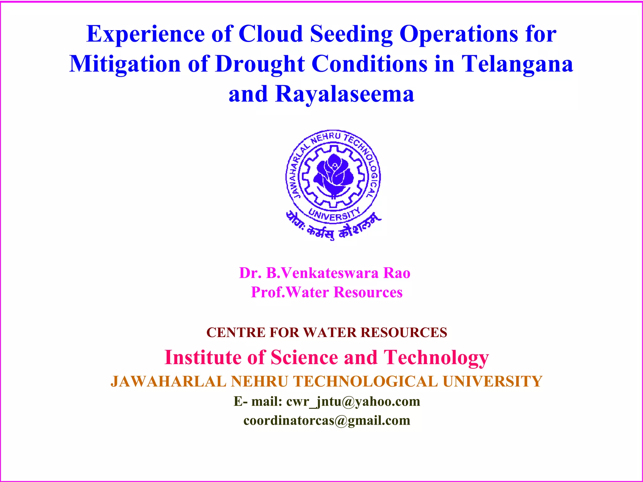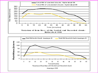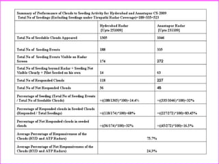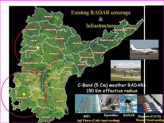 - Cloud seeding experiments have been conducted in India since the 1950s to enhance rainfall. The state of Andhra Pradesh has carried out extensive cloud seeding operations from 2003-2009.