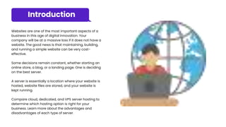 The document emphasizes the importance of having a website for a business and discusses different types of web hosting options: cloud, dedicated, and VPS servers. It outlines the benefits and drawbacks of each server type, noting factors such as flexibility, cost, security, and the level of technical expertise required for maintenance. The conclusion encourages thorough research when selecting a hosting provider to align with business needs.
