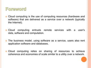 The document discusses cloud computing models including infrastructure as a service (IaaS), platform as a service (PaaS), and software as a service (SaaS). IaaS provides basic computing resources, storage, and networking capabilities. PaaS provides development tools and environments for building applications. SaaS provides users access to applications via the internet without installation or maintenance of software.