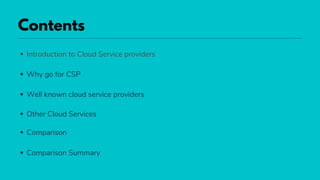 The document discusses and compares several major cloud service providers, including Amazon Web Services (AWS), Google Cloud Platform, Microsoft Azure, Oracle Cloud Infrastructure, SAP Cloud Platform, and Salesforce Service Cloud. It provides an overview of the services offered by each provider such as compute, storage, databases, machine learning, and describes some of their key features and histories. A table is included that compares AWS, Azure, and GCP across several categories like data management, app development, SMB analytics, and machine learning products.