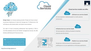 As an eminent cloud services provider, Bridge Global helps you scale and manage your IT infrastructure. Bridge helps you with private, public, and hybrid cloud solutions. Bridge's cloud computing capabilities cover Software as a Service (SaaS), Platform as a Service (PaaS), and Infrastructure as a Service (IaaS).