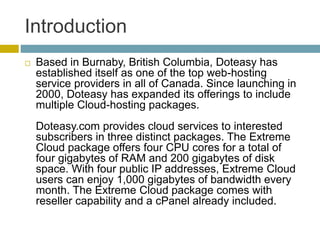 Doteasy, based in Burnaby, British Columbia, offers cloud hosting services through three packages: Extreme Cloud, Power Cloud, and Budget Cloud. The Extreme Cloud package features 4 CPU cores, 4 GB RAM, 200 GB disk space, and 1,000 GB bandwidth, while the Power Cloud includes 2 CPU cores, 2 GB RAM, and 500 GB bandwidth. The Budget Cloud service caters to users with lower needs, providing 1 CPU core and 1 GB RAM at an economical price.