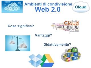 Il documento discute l'importanza degli ambienti di condivisione web 2.0 nel contesto della formazione digitale, evidenziando i vantaggi del cloud computing per memorizzare, elaborare e condividere documenti in modo efficiente. Viene sottolineato come questi strumenti consentano la collaborazione immediata tra utenti, con la possibilità di vedere le revisioni e gestire facilmente i materiali. Infine, viene menzionata la praticità di accesso ai file da diverse piattaforme e la loro organizzazione in cartelle.