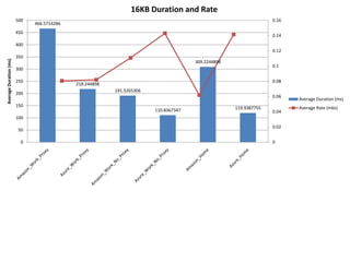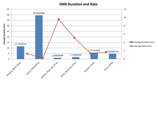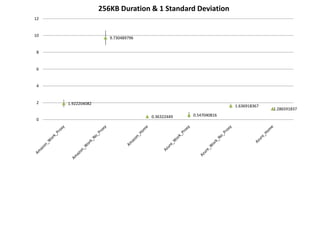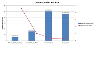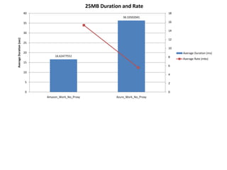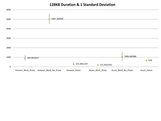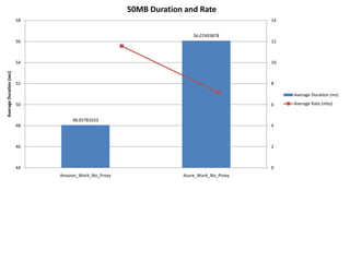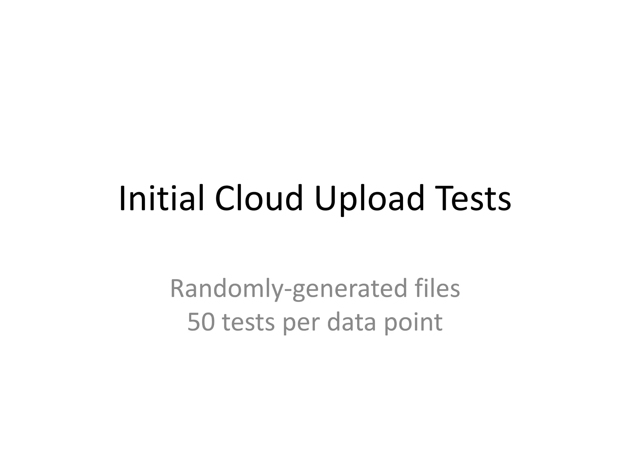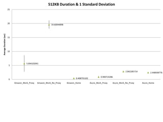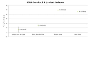 The document summarizes initial test results from uploading randomly generated files to Amazon S3 and Azure Blob storage from different network connections. There were 50 tests conducted for each file size ranging from 50KB to 100MB. The results show that Azure transfers were generally faster than S3, especially without a proxy, and that transfer speeds and variability increased with larger file sizes. The proxy had a significant negative impact on transfer speeds, particularly for Azure.