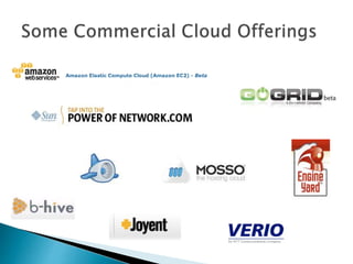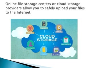 The document discusses cloud storage, which involves storing files on remote servers that can be accessed from the internet. Some key benefits of cloud storage mentioned include being able to access documents from anywhere, easily sharing files, keeping files safe and secured, and getting storage space for free or low cost. Factors to consider with cloud storage services include available storage space, budget, performance, technical support, data protection, and security. Popular cloud storage services discussed are iCloud, Dropbox, Google Drive, Amazon Cloud Drive, and Windows Live SkyDrive.