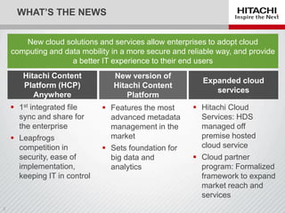This document introduces new cloud solutions and services from Hitachi Data Systems that allow enterprises to adopt cloud computing and data mobility in a more secure way. It describes the new Hitachi Content Platform (HCP) Anywhere, which provides a secure file sync and share capability from an organization's private cloud. It also details expanded cloud services from Hitachi, including a new Hitachi Cloud Service and formalized cloud partner program. The document discusses how the changing information landscape and employee work styles are driving more cloud adoption and the need to address security concerns around bring-your-own-device and consumer cloud usage in enterprises.