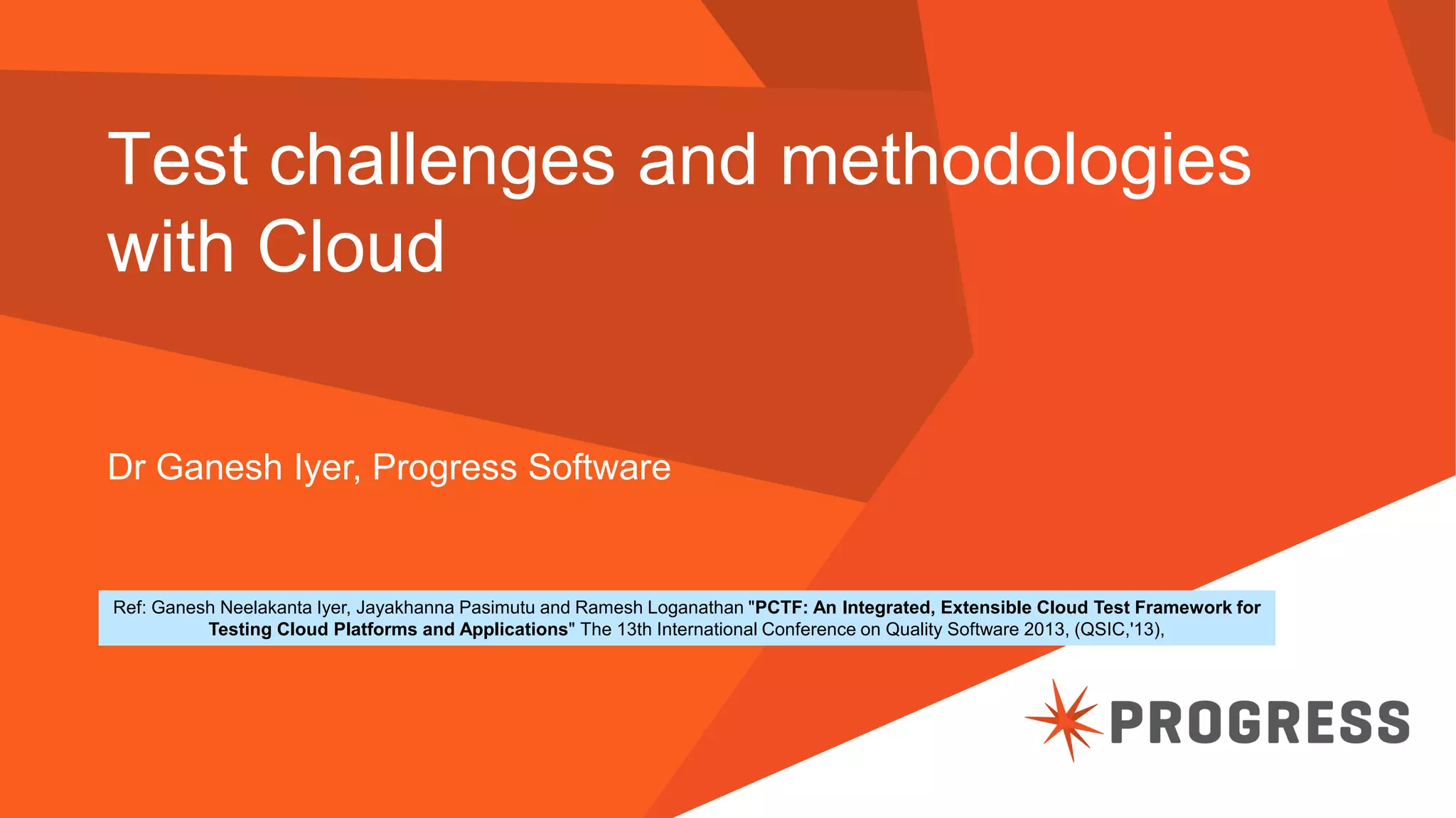 The document discusses test challenges and methodologies for cloud computing. It outlines various dimensions that need to be tested for cloud platforms and applications, including elasticity, security, performance, multi-tenancy, and integration. Testing in the cloud provides advantages over traditional testing such as improved scalability, asset utilization, and reduced costs and environmental impact. Testing as a service (TaaS) is also discussed as a shared services delivery model for software testing on demand.