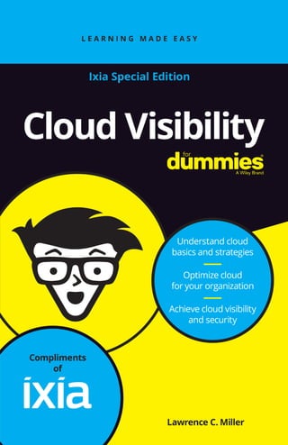 The document discusses the 'Cloud Visibility for Dummies, Ixia Special Edition,' published by John Wiley & Sons, which serves as a guide for technology professionals navigating cloud adoption and management. It includes information on cloud basics, network visibility challenges, security, compliance, and application performance in cloud environments, as well as forecasting future developments. The book aims to assist organizations in assessing cloud options and strategies for successful migration while ensuring operational reliability and performance.