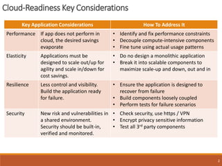 The document provides guidelines for evaluating cloud workload suitability and best practices for cloud architecture. It discusses key considerations for applications in the cloud like performance, elasticity, and resilience. It also outlines suitable and less suitable workloads for cloud. The best practices section describes tactics like designing for failure, decoupling components, implementing elasticity, thinking parallel, optimizing data placement, and security. Examples are given for how to implement these practices on AWS specifically.