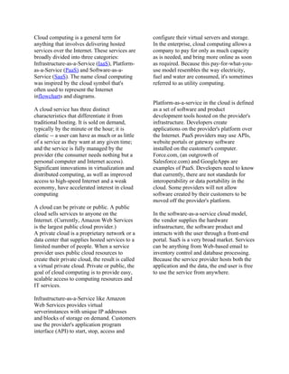 Cloud computing delivers hosted services over the Internet and is broadly divided into three categories: Infrastructure as a Service (IaaS), Platform as a Service (PaaS), and Software as a Service (SaaS). IaaS provides virtual servers and storage, PaaS provides development tools on the provider's platform, and SaaS provides fully managed, front-end accessed applications. Cloud services are elastic, on-demand, and fully managed by the provider. Cloud computing builds on decades of research in virtualization and distributed computing to provide scalable, flexible computing resources and reduce IT costs for users.