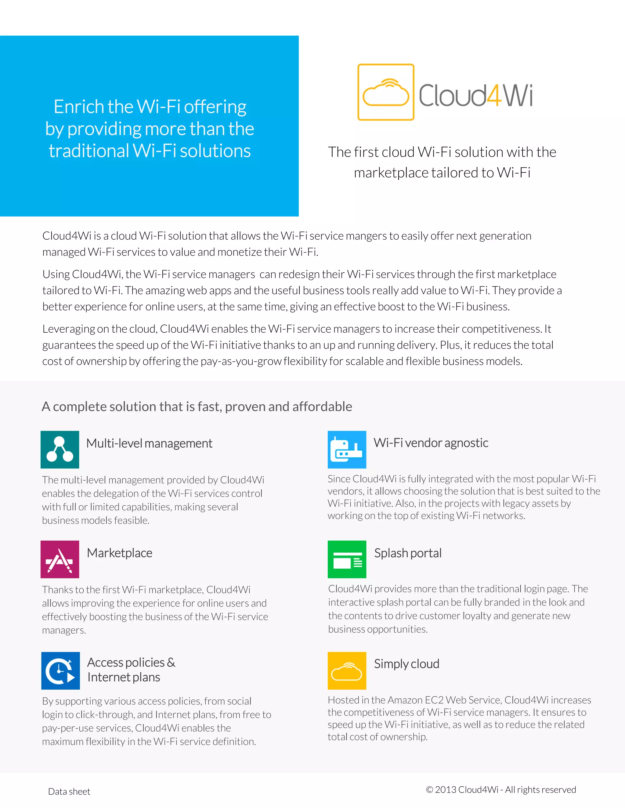 Cloud4Wi is a cloud-based Wi-Fi solution that allows Wi-Fi service managers to offer managed Wi-Fi services and monetize their networks through a marketplace tailored for Wi-Fi. It enables increased competitiveness and reduced costs by offering scalable pay-as-you-grow models and ensuring quick initiative speeds through cloud-based delivery. The solution is vendor-agnostic, offers various access policies and internet plans, and provides analytics and multi-level management capabilities.