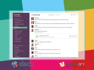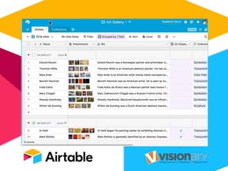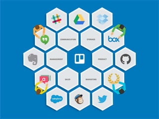 Trello, Slack, Evernote, and Airtable are collaboration and productivity tools. Trello uses boards, lists and cards to manage projects visually. Slack is an instant messaging system with channels, direct messages and file sharing. Evernote allows users to take notes, clip web content, and organize information across devices. Airtable is a spreadsheet database hybrid that stores information in customizable tables, fields and records that can be viewed and shared in different ways.